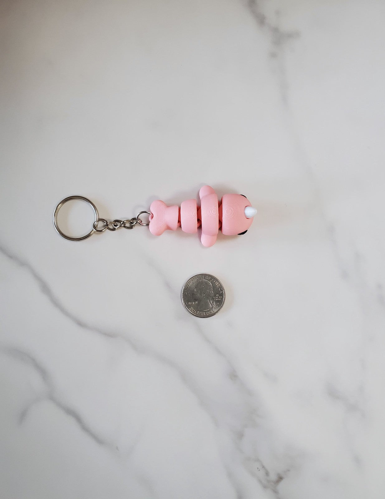 Narwhal measures approximately 2.25" from snout to tail and 1.25" wide. Body is movable. Each narwhal has a 1" metal keyring attached below the tail.