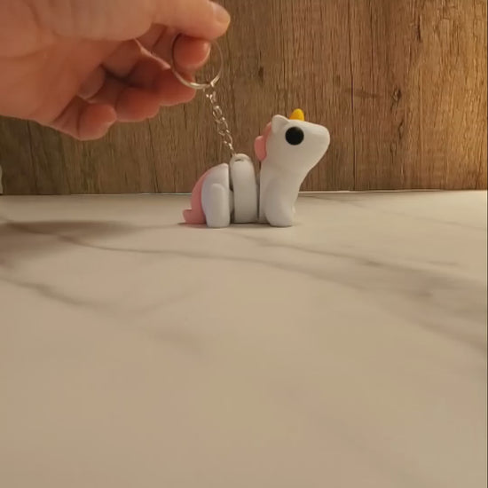 Unicorn measures approximately 2.5" from nose to tail and 1.3" wide. Body is movable. A 1" metal keyring is attached to its back.