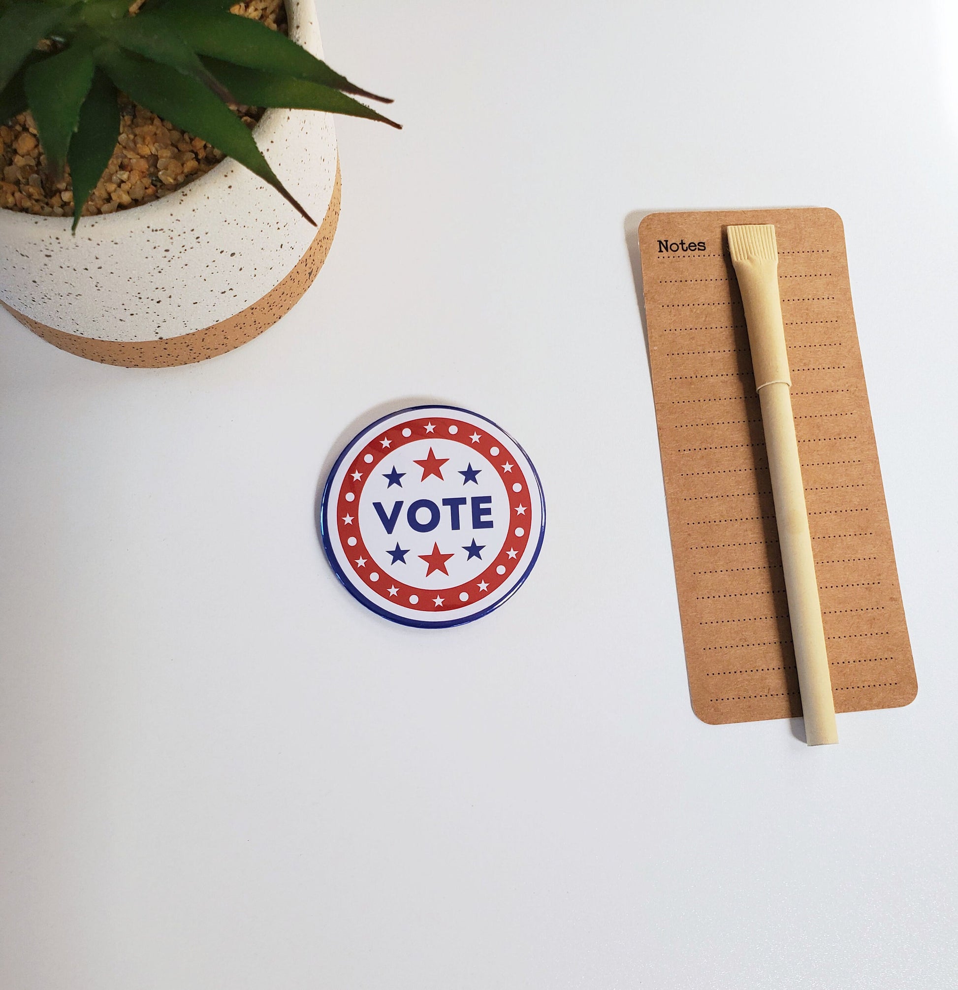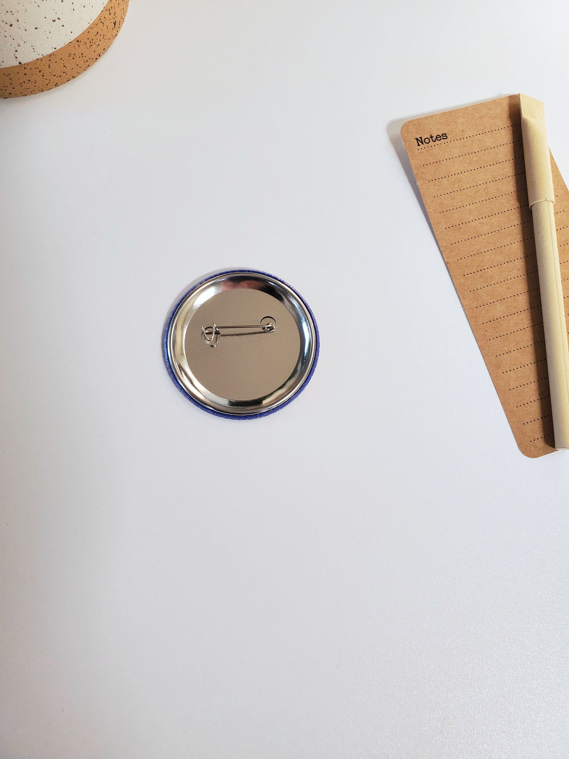 Buttons have a metal shell and pinback and a clear mylar layer.