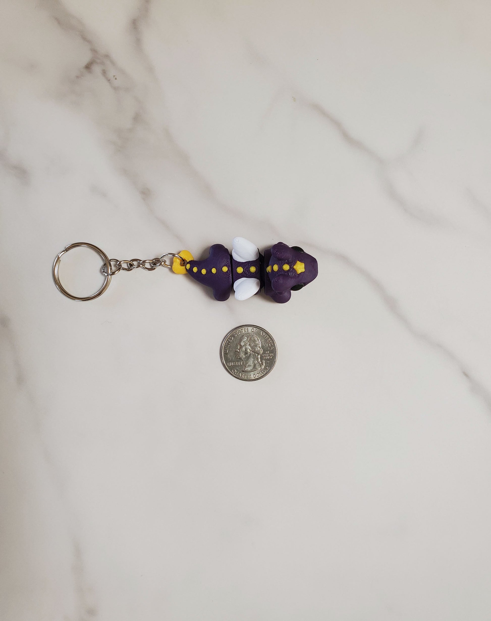 The dragon measures approximately 2.25" from nose to tail and 0.75" wide. Body is movable. Each dragon has a 1" metal keyring attached.